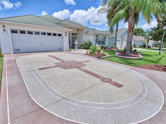 The Village of Sunset Pointe - Camellia model (Gardenia FP, 3rd bedroom has NO closet). Just minutes from both Lake Sumter Landing Town Square & Cane Garden CC. Spectacular 1 of a kind custom drive & walk-way leading past a pineapple lamp post & sitting area with with free standing fountain to a glass leaded front door with transom window. The foyer with its pendant light, pineapple sconces and mosaic tile invite you to an open concept split bedroom Designer home. There are volume ceilings in the living area, whole house surge protection, "Cross-Fire" 5 unit alarm smoke, heat & carbon monoxide system that complements the regular unit. As you continue into the home, there is 20x20 diagonal tile that connects the dining & family room. A 12 ft slider leads to the covered/screened lanai with roll down blinds. The kitchen with breakfast nook is highlighted w/raised maple cabinets, roll out drawers everywhere, deep double stainless sink, granite counter tops, breakfast bar, tiled back splash, under & over cabinet lighting, gas range & stainless appliances. Inside laundry comes with Maytag washer/gas dryer. The owners suite with lush carpeting has dual closets, dual vanities, roman walk-in shower & linen closet. The guest wing has a separate bedroom and spacious den (no closet) with bathroom between. There is a spacious two car garage, paver grill pad of of rear screen door, raised landscaping with block wall, gutters and downspouts & multi zone irrigation system. Fountain & Kitchen island included. See Video.