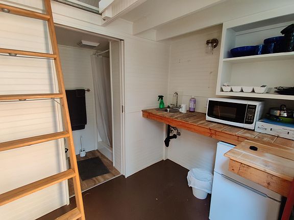 This tiny house (14x8) has great natural light with a good-sized window and a barn door opens to the deck area. Queen bed, with under bed storage. Kitchenette with sink, microwave, small fridge. Half bath with composting toilet. Air conditioning Separate, private entrance/access on the side of the main house. Month to month, utilities included 1-2 tenants max. Renters must have their own insurance, own postal box/mailing address. Pets considered on a case-by-case basis.