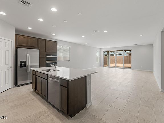Up to 3% of base price or total purchase price, whichever is less, is available through preferred lender plus additional 2% of base price or total purchase price, whichever is less, is available to be used toward closing costs, pre-paids, rate buy downs, &/or price adjustments. Almost ready for move-in. This single-story Barletta floor plan features 3 bedrooms + den and 2 baths. Enjoy an open layout with a center-meet sliding glass door in the gathering room, a chef's kitchen with stainless steel appliances, 42'' slate cabinets, and quartz countertops. Two-tone paint and upgraded flooring throughout. Washer, dryer, fridge, and blinds now included.