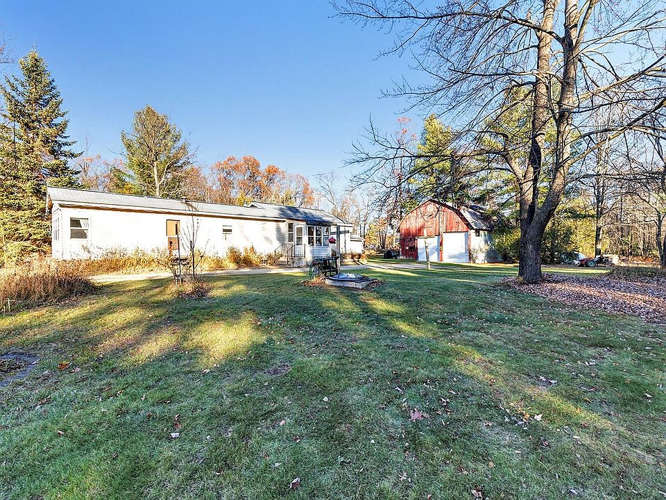 1.12-acre country setting with a variety of fruit trees, 1 garage, a barn and 2 sheds. Only 5 minutes from the Bass Lake and 10 minutes to Shawano Lake. Enclosed front entry surrounded by windows opens to living room and kitchen with hardwood flooring. Kitchen appliances are included. There are 2 bedrooms with 1 offering laundry hook-ups. Newer furnace and a heated bonus space in back with door leading outside. Abundant storage with a 1 car garage, 4 car tandem 30x30 barn with 2 lean-2 canopies, an 8x10 and another 8x12 storage shed.