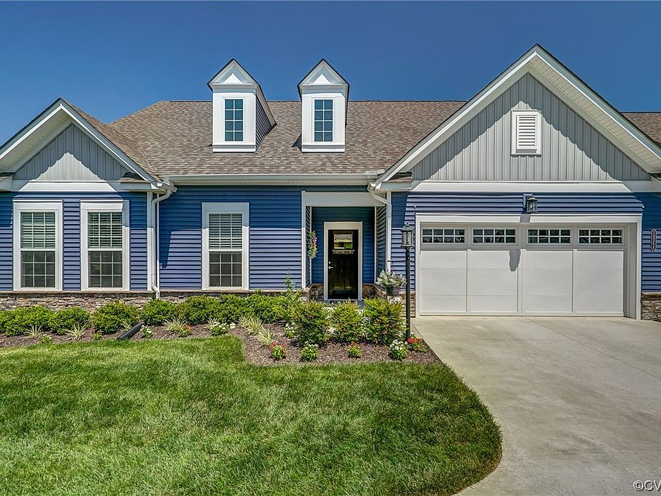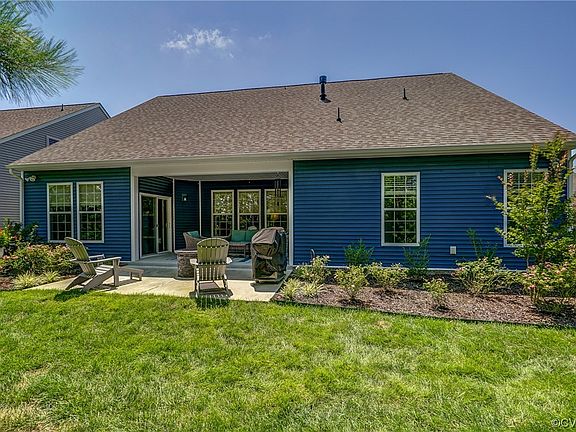 Move-In Ready in Hanover's 55+ Agri Community-Chickahominy Falls, this Craftsman-Flair Beauty is Like-New & loaded w/ upgrades, including a Premium Lot which backs up to the woods! Front Entry opens to spacious Family Room w/ Wood Floors, Stone Gas Fireplace, Custom Book Case, triple windows that look out over private Lanai & Open to Gourmet Kitchen w/ Large Granite Center Island, soft close drawers & pullouts & Corner Pantry w/ bright Morning room including 3 transom windows which overlooks private rear yard area. 2 Bedrooms on left w/ tiled, Full Hall Bath, 1st Floor Primary Suite including Tray ceiling, carpet, His/ Her Closet (Hers has Custom Closet System!) & Attached Full Tile Bath w/ shower, double vanity & linen closet. 1st floor Laundry w/shelving, 2 Car Front Entry Att. garage opens from Foyer. 2nd Level has Flex Room/Hobby Room/Office/Exercise Room w/ carpet & storage. Huge Unfinished Space upstairs is great for storage! Amenities here are stunning, w/ fully equipped Clubhouse, Pool, Gym, Outdoor Bar & Grill, Dog Parks, Picnic Areas, Walking Trails, Pond & Firepit. Join community clubs/events or volunteer at the 10 acre organic garden & farmers market!