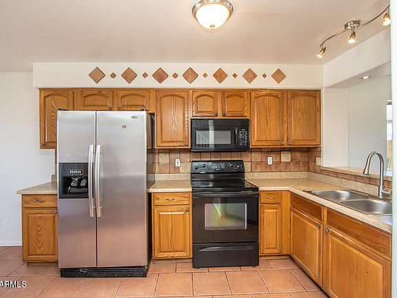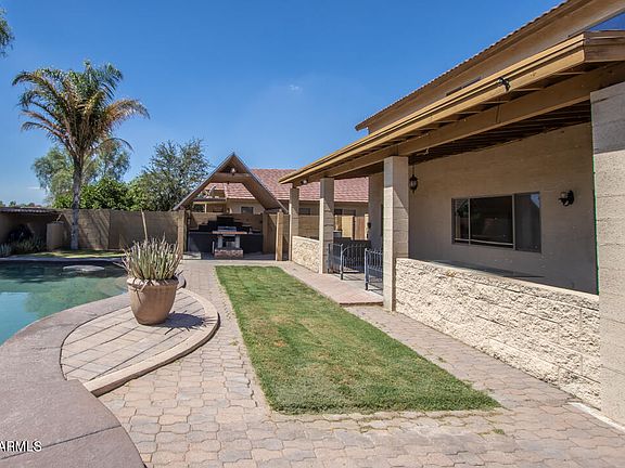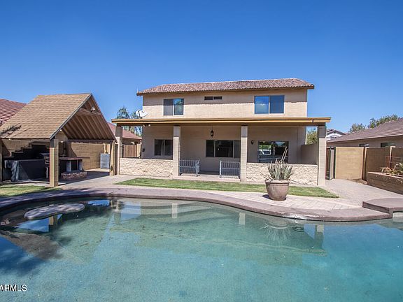 This is the kind of DEAL that makes house shopping on a 110 degree day WORTH IT. Full bedroom and bathroom on main floor with additional 3 bedrooms upstairs. A true entertainers dream; ample kitchen space, full length covered patio accompanied by a 30FT pool, a completely shaded customized kitchenette with an island for all of your bbq's to come. This home offers too much STORAGE than you'll know what to do with. Each side of the home offers extra space, including brick storage customized by a masonry and covered bike parking. Don't worry, the inside is just as good as the outside. The layout offers the perfect balance of coziness and privacy with beautiful tile throughout, that's right, NO CARPET. The master has it all, large bathroom and an even bigger walk-in closet. Don't miss out!