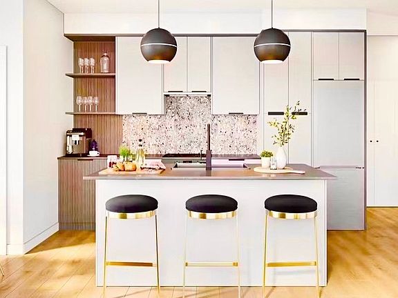 High-quality finishesModern kitchenStainless steel appliancesCustom cabinetrySleek quartz countertopsContemporary matte black fixturesLarge-format porcelain tiles