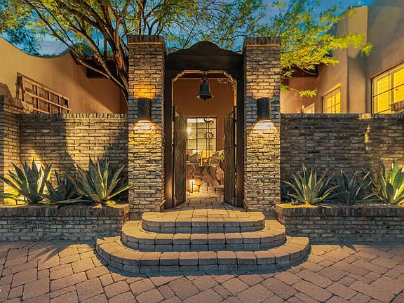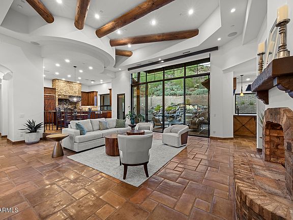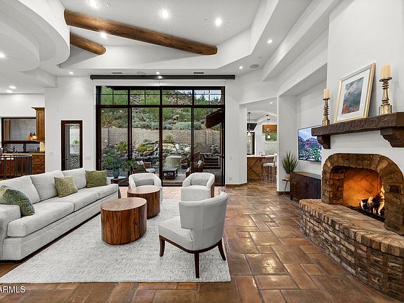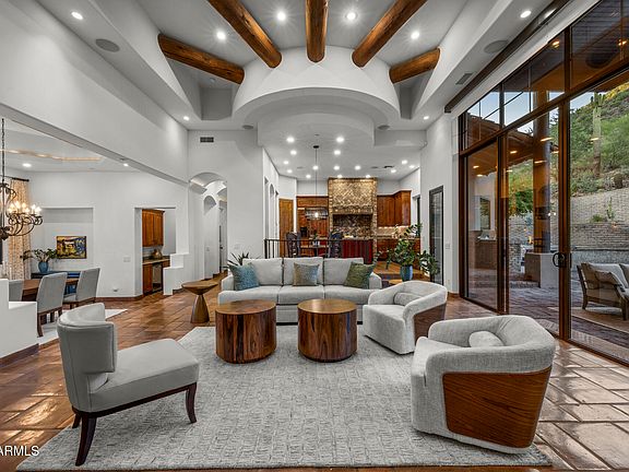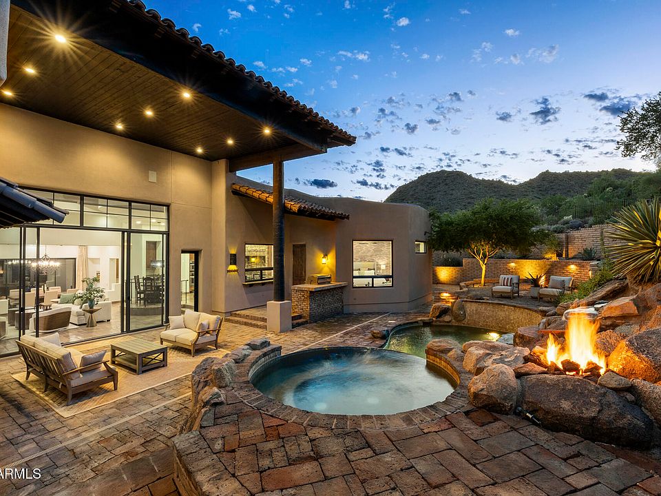 Tucked against the McDowell Mountains in the double-gated enclave of Hidden Hills, this Luxury Hillside Hacienda sits on 1.267 acres, inviting you to slow down and savor the beauty of desert living. Blending authentic character with modern sophistication, viga-beamed ceilings soar 16 feet high while a wall of windows fill the great room with light and warmth. A custom copper-topped bar anchors the entertaining space, and en-suite bedrooms with private patios seamlessly blend indoor comfort with outdoor serenity. Smart-home features place lighting, pool systems, and window blinds at your fingertips, while thoughtful design keeps the atmosphere elegant and inviting. The attached casita—with private entry, garage, and over-sized walk-in closet—offers ideal guest accommodations. MORE... The backyard is a private sanctuary, featuring a pebbled pool with cascading waterfall, fire features, and new turf. Multiple intimate seating areas create perfect spaces for stargazing and outdoor dining.