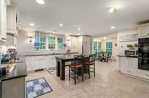 Moments to RT93/495, by West Parish in Andover, sits this bright 2600 sq. ft ranch with multiple upgrades that include kitchen, master bath, high-efficiency gas burner, fenced backyard, roof and carpets. Single level living with 3 bedrooms, 2 ½ baths and naturally bright upgraded kitchen flows into the breakfast room. Kitchen boasts tile, granite, SST appliance, island, dual wall ovens and two sinks. Large living and dining rooms are centered by 2 fireplaces. Master bedroom has an upgraded ELFA closet system and new bath. Huge second floor bonus room is accessed by an oak spiral staircase, for home office, exercise, storage or a playroom. The backyard with perennial garden is fully enclosed by a new fence. Ideal for dogs and quiet, private outdoor relaxation. Attached two-car garage is accessed via the mudroom for protected ingress/egress.