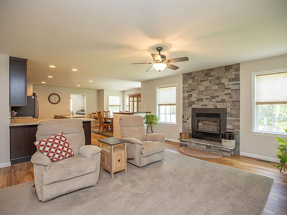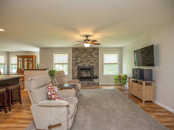 Better than brand new! This custom built one owner ranch is in immaculate, move-in condition! Many additional features have been added. Much of the 5 acre lot is cleared with stone edging around wooded features and a landscape highlight is a small pond. Buried utilities from the road. Open concept design has a front entry to a living area with cultural stone fireplace with built-in heatilator woodburner with glass door by Heartline in Jaffrey, NH. Dining alcove. Kichen with an expanse of counter space. Walk through the double sided pantry to access the concrete patio. A laundry room/mudroom, also off the kitchen, accesses the attached two car garage. Adjacent is a utility shed. The master bedroom has oversized closet and private bath with jetted tub, stall shower and double sinks. Two additional bedrooms and hall bath on the main floor. Lower level has slider to paver patio, recreation room with wet bar, game room, exercise room, bedroom, shower bath, storage room, and utilities area. Luxury vinyl plank flooring and ceiling fans in every room. An HVAC system heats and cools the house. Rinnai "instant" hot water. Whole house automatic generator. Occupancy October 1st, 2023 or later.