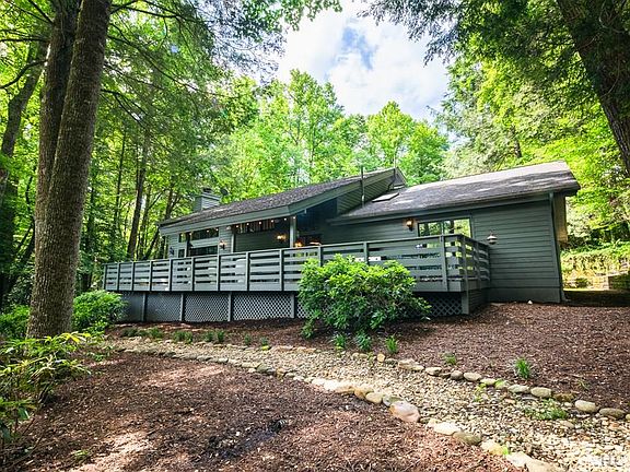 A Golfer's Paradise!..this low maintenance house rests on Hole#2 of the Fairway surrounded by mature hardwoods. The unique architecture creates a grand appearance in the open living room w/vaulted ceilings, exposed beams & a massive floor to ceiling fireplace & gives room to entertain as you drift into the updated kitchen w/stainless appliances & oversized center island w/quartz countertops. Custom designed cabinetry equipped w/soft close hardware. You will be captured by the view of Hogback Mtn. while relaxing on your back deck gazing across the golf course after a round of one of the most beautiful & challenging courses in WNC. The one level features a large master bedroom, huge bathroom w/jacuzzi soaking tub & walk-in shower plus access to the deck. Guest bedrooms are spacious & extends room for friends & family. This upscale residence is rare & offers the best best things in life - golfing, tennis, lakes, pool, fishing, hiking & even grab your favorite dish at the country club.