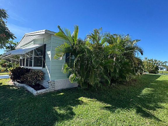 Lovely 2-bedroom 2-bath Lake view home. This home is located in the desirable 55+ Spanish Lakes Country Club Village community. The home has a beautiful lake view on two sides--screened-in patio which has windows that can be closed for future A/C. Patio is overlooking the lake, great for morning coffee and evening cocktails. Added a 12X28 Patio for enjoying the Florida sun. This home has laminate and carpet flooring. The home has built-in shelves in the dining area that provide additional storage. The primary suite bathroom has a built-in jewelry cabinet, new toilets, and a vanity. Roof is 2022, Vapier barrier and tie downs 2022. The carport will be replaced this month. Home is being sold partially furnished. Lawn care and trash removal are included in the lot rent. 2 pools, shuffleboard shuffleboard, bocceball, pickleball, tennis, and much more. MUST SEE