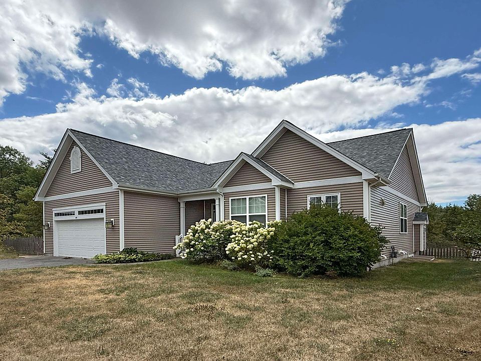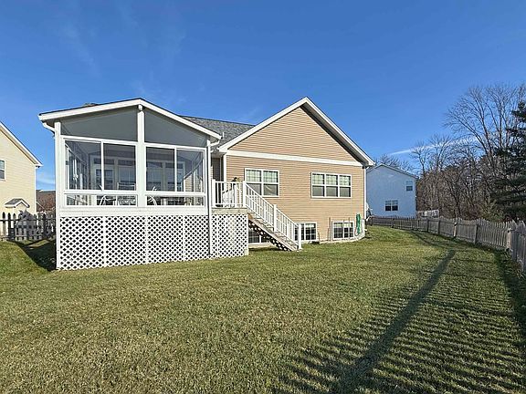 This 4-bed, 3 bath ranch style home offers the option of comfortable single level living, with a nicely finished lower level that provides additional space. Located on the outer ring of Fields Road, this home is nicely situated to enjoy western exposure, privacy and wetland views in the back, while still part of a development and close to community. Entering through the formal foyer with access from both the front stoop and the attached two car garage (with ramp) there is ample room to welcome guests and kick off your shoes. The foyer flows seamlessly into both the spacious, eat-in kitchen; featuring maple cabinetry and granite counter tops, as well as into the great room with cathedral ceilings, a gas fireplace and open living/dining areas. Anchored by a gas fireplace hearth, the living room also features French doors which provide access to the light filled sunporch with glass/screened windows, tumbled marble flooring, wetland views and access to the small, easy to maintain back yard. Down a short hall from the great room, you’ll find a ¾ bath, laundry closet and two bedrooms, including the homes large primary bedroom suite with a 4-piece bath and walk-in closet. The mostly finished lower level consists of a large family room, another full bath, two additional bedrooms, and an unfinished portion for storage and mechanicals. Outdoors, many will appreciate access to the MALT trails right around the corner, and the in-town location with easy access to groceries and shopping.