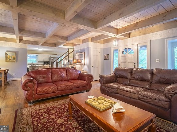 Incredible cash flowing and fully furnished short term rental home in in the heart of downtown Helen. Strong record of rental performance (financials available) and designed for effortless group living. This expansive property is arranged around a private courtyard with a beautiful pool and poolside hot tub, plus ample seating and a covered porch for year-round enjoyment. The main house showcases a dramatic beamed great room with fireplace, hardwood floors, and multiple seating zones; an open, fully equipped island kitchen (stainless refrigerator, range/oven, dishwasher, microwave, drip & Keurig coffee stations); and a window-wrapped sunroom with breakfast nook, half bath, and direct pool access. A dedicated laundry room with washer, dryer, and utility sink adds everyday convenience. Sleeping spaces in the main house include four private bedrooms (two with en-suite baths) plus the distinctive octagonal room that links to the pool deck which is ideal as a flex sleeping room, lounge, or studio. Baths are thoughtfully finished, including a double-vanity hall bath, walk-in showers, and a soaking garden tub. The Pool House elevates the experience with soaring tongue-and-groove ceilings, a vaulted lounge with game area (regulation pool table, darts), dedicated king sleeping area with full bath, and an airy loft bedroom. Outdoors, enjoy a fenced and gated pool area, chaise lounges, string-lit covered porch, and a BBQ smoker grill (gas/charcoal combo). Practical perks include fast Wi-Fi, multiple Smart TVs and a 2-car carport with easy kitchen access. Moments from Helen's shops, dining, tubing, and trails, this turn-key retreat offers exceptional personal enjoyment and documented income performance.