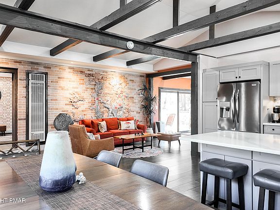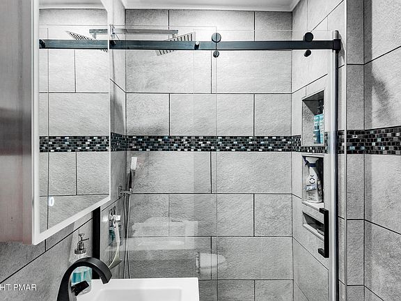 Step into a rare find just a short walk from the lake and community center. Thoughtfully renovated from top to bottom, this custom ranch has been transformed with vaulted ceilings throughout, giving it a warm mountain-home feel while preserving its solid structure. The manicured landscaping sets it apart from typical wooded lots, offering space to gather, play, or simply relax by the fire pit. Inside the stone counters, designer lighting, and custom tile work pair beautifully with authentic wood plank floors and artistic touches. Climate control is effortless with mini-splits plus a top-tier radiator system featuring dual electric and propane for peace of mind. The finished lower level adds creative living space with motion-lit stairs and custom-painted walls. Whether you're seeking single-level living or investment potential near ski slopes and waterparks, this home blends comfort, quality, and location in one exceptional package.