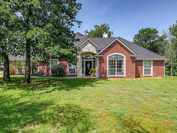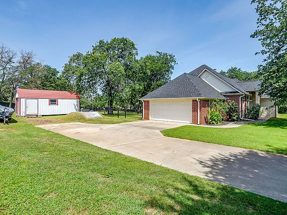 Beautifully crafted, custom home located on a quiet cul de sac in the family friendly Heritage Oaks subdivision. Nestled among mature oak trees and sitting on 1.73 acres, this beautiful home offers peace, privacy and plenty of charm. Featuring a classic brick and stone exterior, this three bedroom, two bath home includes two spacious living areas, a wood burning fireplace, tray ceilings and crown molding. The large kitchen overlooks the serene backyard with pipe fencing and features custom cabinets, corian counters and a nice size breakfast area. The spacious primary suite has beautiful laminate flooring and room for a desk or sitting area. The ensuite bath features dual sinks, a jetted tub, separate shower and double walk-in closets. Two nice size secondary bedrooms and guest bath complete this home. Outside you'll find mature oak trees, pipe fencing, landscaping, a large storage building with electricity, RV hook up, an in-ground tornado shelter and an extended driveway for extra parking. Unlike most new construction homes, this property offers more land, fencing, established trees and essential upgrades already in place - saving you time and money. Don't miss the opportunity to own this peaceful retreat with all the comforts of small town living. Close to schools and an easy commute to Azle - 15 minutes, Weatherford - 22 minutes and Fort Worth 40 minutes. If you feel like a little day trip to Winstar you're only a little over an hour away.