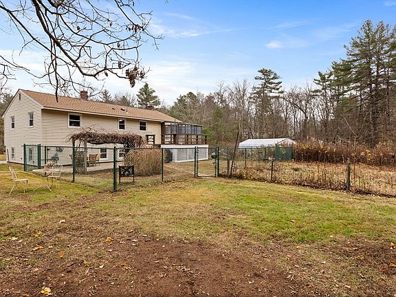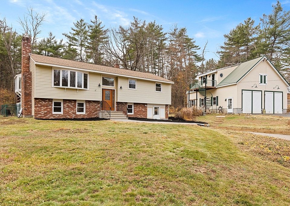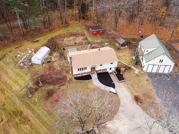 Charming & private 3-bed, 2-bath Split Entry with over 2,000 SQFT. plus a 27 x39’ detached heated 4-car garage (2-car deep, 2-car high) perfect for a car enthusiast! Open main level features a bright living room with a gas fireplace insert, dining area has access to a 3-season sunroom, and a spacious kitchen granite counters & stainless appliances. Updated & freshly painted interior. Three generous bedrooms & full bath with double vanity & soaking tub complete this level. Walk-out lower level offers a family room with wood fireplace & gas stove, office, bath, laundry, and workout space. Above the garage is a bonus room perfect for a game room or office. Enjoy the private fenced yard, greenhouse & lush gardens. Updates~new roof & walkway (11/2025), Viessmann heating system (2018), newer windows & updated flooring, solar panels & 2017 energy audit. Fantastic location near Townsend Center, 39 acres of state forest & Squannacook River Rail Trail behind the house! Two possible ADU units.