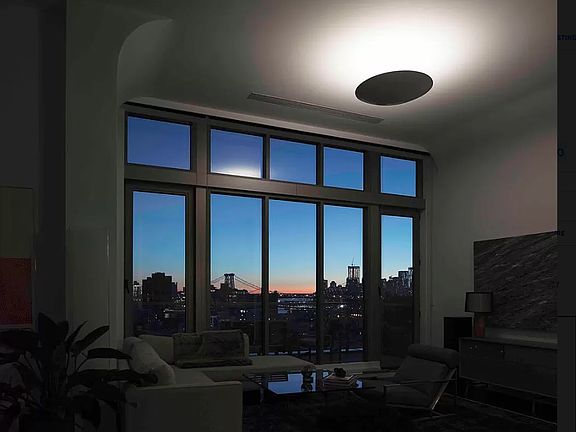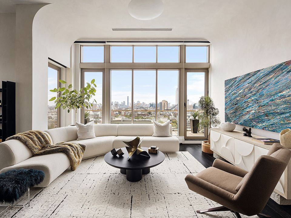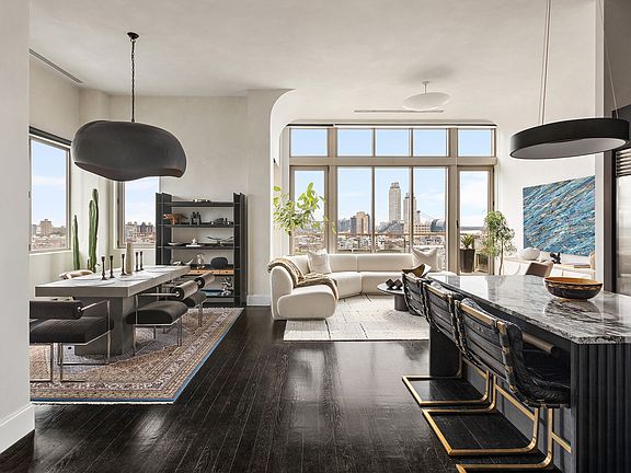 Enter the home through a 10-foot tall front door into a stunning foyer with cove ceiling detail, two large art walls, and a massive entry closet. The great room is wrapped in floor-to-ceiling windows facing south and east and offers a separate living and dining area as well as an eat-in kitchen. Soaring ceilings, bold materials, and incredible natural light make this room one of the most unique and dramatic spaces in Williamsburg. The kitchen has been completely reimagined with brand new cabinetry, countertops and backsplash & the addition of a large island with seating for three. There is also an impressive appliance suite featuring both Bertazzoni and Sub-Zero. Off the main living room is an 80-square-foot south-facing terrace with mesmerizing views of Brooklyn, the Williamsburg Bridge, the downtown skyline, and the east river. Adjacent to the main living room is the home's proper dining area with seating for six.