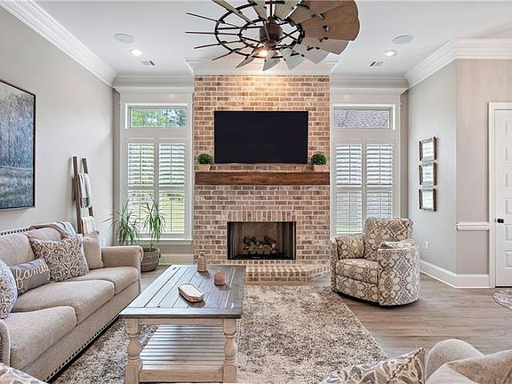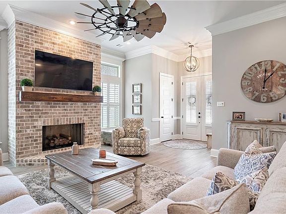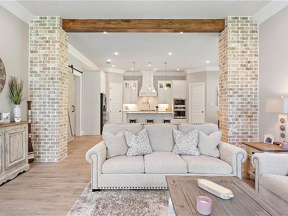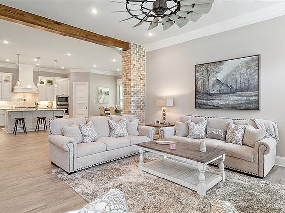 This home shows like new! Wood look tile in all living areas + primary bdrm; brick opening with exposed beam between den & kitchen; fabulous kit with glass front upper cabinets with lighting, lg island with farm sink and additional cabinets below; tray ceiling with shiplap inlay in primary bdrm; free standing tub in primary ba; plantation shutters throughout; barn doors in primary and hallway; separate office with built-in desk; mudroom area; brick cov patio; gutters; home backs to green space; fld zone C.