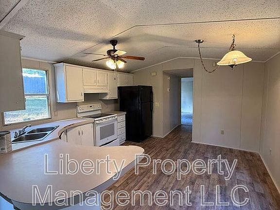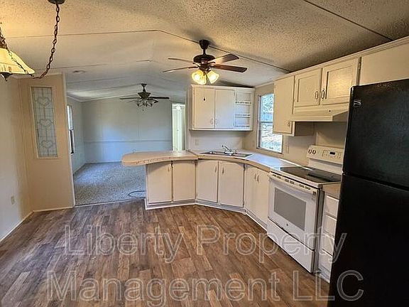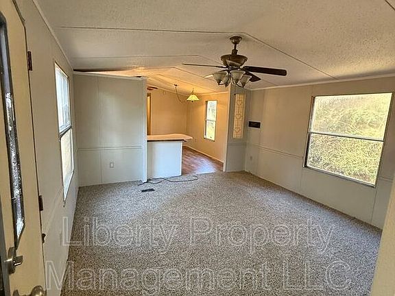 This 2-bedroom, 2-bath single-wide sits on a wooded lot that offers privacy with no neighbors directly behind you. The home has been updated with fresh interior paint and new carpet in the bedrooms, giving the space a clean and comfortable feel. The kitchen features white cabinets and opens to the living room, creating a functional layout for everyday living.