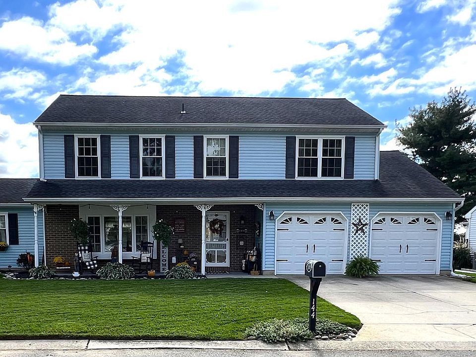 Welcome to this beautifully maintained colonial offering 4 bedrooms, 2.5 bathrooms, and a spacious two-car garage. From the inviting curb appeal to the thoughtfully updated interior, this home is move-in ready and ideal for both daily living and entertaining. The main level features multiple living spaces, including a bright formal living room, a cozy family room with vaulted ceiling and skylights, a dining room opens to the kitchen with breakfast bar featuring shiplap. The updated kitchen showcases white cabinetry, tile backsplash, stainless steel appliances, and a sunlit breakfast nook with backyard views. Hardwood floors extend throughout much of the first level, adding warmth and elegance. Upstairs, the large primary suite offers a walk-in closet and a beautifully updated en-suite bath with tiled shower. Three additional generously sized bedrooms and a full hall bath provide ample space for family or guests. Outdoor living shines with a fully fenced backyard featuring a patio, fire pit area, and storage shed with electric. The landscaped yard is well maintained with stone-edged beds and mature plantings. Additional amenities include a covered front porch for your morning coffee or evening cocktail, wide driveway, updated windows, neutral paint throughout, and stylish finishes that enhance the home’s timeless appeal. Nestled in a desirable neighborhood, this property combines charm, function, and modern updates.