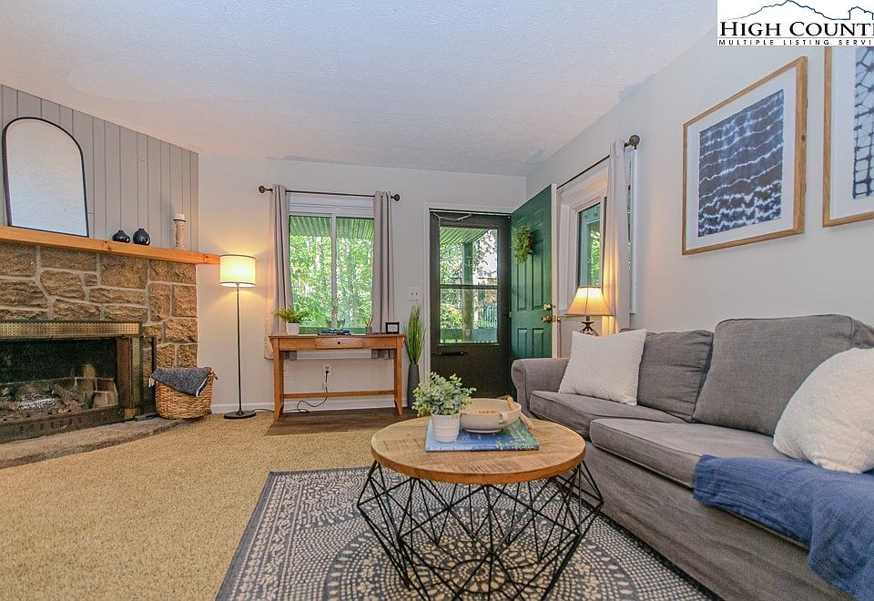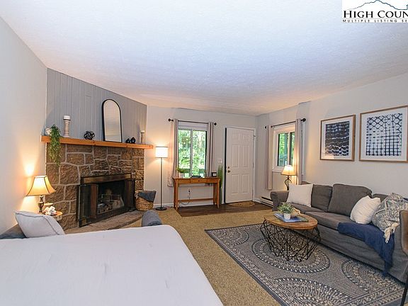 Nestled in the desirable South Slope area of Foscoe, this charming efficiency condo offers the perfect mountain retreat between Boone and Banner Elk. Thoughtfully updated throughout, the unit features a brand new kitchen with quartz countertops, stainless steel appliances, and sleek new cabinetry. Stylish new flooring and windows enhance the bright, inviting space, while the cozy stone fireplace with new gas logs adds warmth and character. The layout is surprisingly spacious, offering room for a queen sized bed and a separate seating area—no need to compromise with a pull-out couch! Bar seating at the kitchen counter, a generous closet, and stackable washer and dryer add convenience to the well designed interior. Step outside to a covered porch that overlooks a peaceful, creek fed pond perfect for morning coffee, quiet evenings or expanding the living space for entertaining. Efficiency living doesn’t have to feel cramped, here it feels complete.