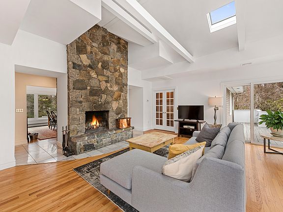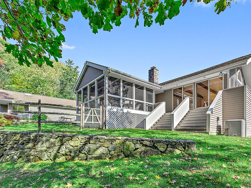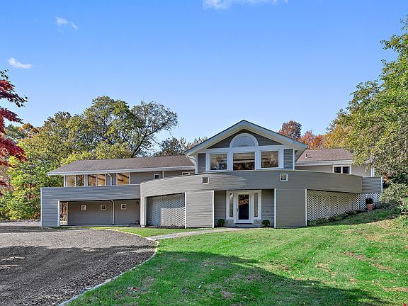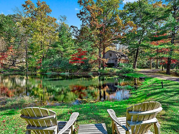 Dramatic, sun-filled, contemporary home overlooking glistening ponds and woodlands, set nicely on 3.5 park-like acres with many specimen trees. Vaulted beamed ceilings and skylights. Walls of windows and glass doors bring the outdoors in. Beautiful screened-in porch, patio and decks for indoor/outdoor entertaining. Renovated, gourmet, eat-in kitchen with Viking appliances. Spacious great room with fireplace. Dining and living rooms each with stone fireplace. Master suite with large bath, two additional bedrooms with hall bath. Generous storage. Generator with automatic-transfer switch installed. Converted 1100-sq.-foot, two-story barn, perfect for office or studio with ability to add a half bath. under ground electric fence for dogs. Come and enjoy country living surrounded by the sounds of nature.