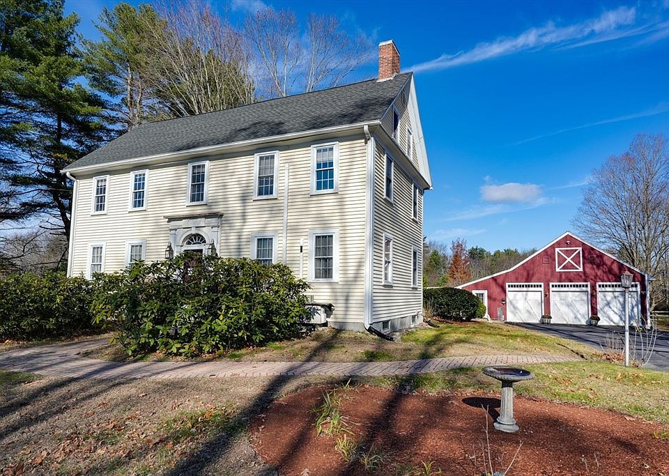 Historic Antique circa 1850 pastorally sited on 2.4 acres complemented by 30x36 barn/3 car garage, paddock, small apple orchard, older barn, just a gorgeous setting.This center entrance colonial is highlighted by 5 fireplaces, wide pine floors, and spacious rooms. The heart of the house is the large 24' kitchen warmed by woodstove with abundant cabinets, corian counters and sunny breakfast area. There is a convenient first floor bedroom and bath on this floor as well as the gracious living and dining room each with a fireplace. The 2nd level offer main bedroom with bath, spacious 2nd bedroom with fireplace, 3rd bath, and two recently renovated bonus room with backstair case to laundry area. The attic has two rooms but used for storage. The grounds are beautifully maintained and the pool was filled in. Additionally there is a back-up generator. The rustic 35x9 porch is delightful for outdoor living. This distinctive home is close to schools, and great for commuting.