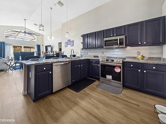 Meticulously maintained 5BR/3Bath salt-water pool home to enjoy year-round, use as a 2nd home or an income-producing asset. Gated & secure community with beautifully landscaped grounds and FHA first-time homebuyer approved. This home has high vaulted ceilings that frame an open-concept floor plan for your family to gather. New porcelain tile floors throughout, newer appliances and a water filtration/softening system. Primary has a spa-style tub, separate standing shower & double sinks. Hurricane impact sliding doors installed for added comfort and protection. The pool is heated & jetted w/ LED light system, child-proof fence & summer kitchen & grill included for outdoor enjoyment. EV TESLA charger included. Low HOA,. Close to Orlando & DISNEY with many more attractions at your fingertips.