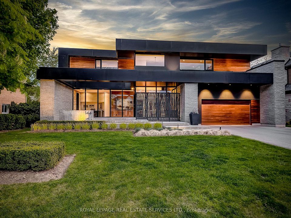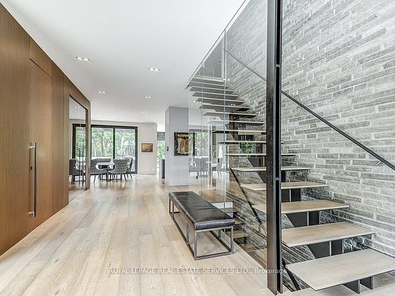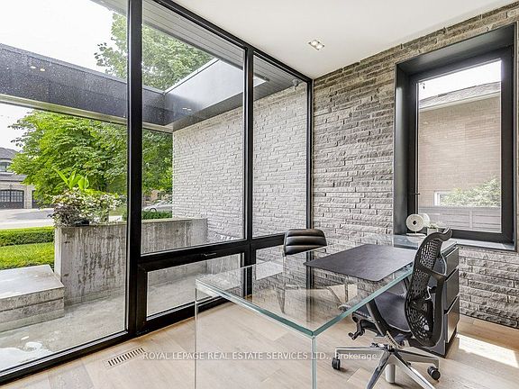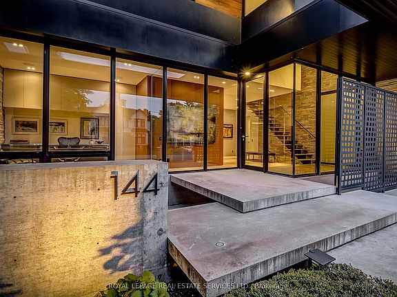 Welcome home to 144 Sparling Court, a showstopping custom residence nestled on a quiet cul-de-sac in Southwest Oakville. Inspired by mid-century modern architecture and the principles of Feng Shui, this thoughtfully designed home blends glass, steel, wood, and natural stone to create a modern masterpiece with over 6,300 sq. ft. of living space. Every inch of this home is curated for luxury and functionality. The dramatic front entry features a heated walkway, reflecting pond with waterfall, and a 9.5 industrial glass door. Inside, the two-storey foyer showcases a natural stone feature wall, hydronic heated floors, and floating staircases with floor-to-ceiling glass panels.The main level offers a sunken great room with a 5.5 ft gas fireplace and 16 ft Hearth, a custom kitchen with Dekton counters, premium built-in appliances, and an oversized island with waterfall edge. Two Massive sliding walls open completely to a South Beach-inspired backyard oasis with a saltwater pool, multiple decks, and two Tucci umbrellas-perfect for entertaining. Additional highlights include a Zebra Teak feature wall with hidden powder room and glass wine room, Control4 home automation, and a dedicated office with custom cabinetry and views of the reflecting pond with calming waterfall feature. The mudroom/paw spa features a pet shower, ample storage, and garage access.Upstairs, you'll find 4 spacious bedrooms with built-ins, including a luxurious primary suite with walk-in closet and spa-like ensuite. The lower level includes a theatre lounge, fitness room, wet bar, and ample storage.Located just a block from Appleby College and the lake, this home redefines modern living.
