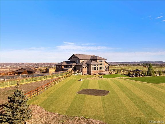 Tucked behind a private gate, find this completely remodeled property & home framed by panoramic mountain views & golden sunsets over Pikes Peak. Inside, soaring 25' ceilings & exquisite finishes set the tone for a space designed to impress & invite. The chef’s kitchen is a dream for culinary enthusiasts, featuring double dishwashers, 4 ovens, a pot filler, wine & beverage coolers, & a walk-in pantry concealed behind rustic barn doors. The main-fl primary retreat is complete w/ a cozy fireplace, dual toilets, a spa-inspired 3-head shower, & direct access to the mudroom. Upstairs, 2 spacious en-suites each offer their own soaking tub, walk-in closet, & breathtaking mountain views & a loft. The basement provides even more space to unwind & entertain, w/ a theater, billiards room, full bar, & a professionally soundproofed music studio (can be a bedroom) w/ its own bathroom, in addition to a private en-suite bedroom. Step outside & you're surrounded by mature pines, new trees, & stone-lined paths that leads to a 16’x16’ gazebo, a fire pit crafted from hand-selected ranch stones, a luxurious spa & mini putt golf course. The rear patio features a state-of-the-art built-in grill, portable pizza oven, & a sleek wind-blocking glass wall for year-round gatherings. Two thoughtfully designed barns—one nestled by the meadow for horses, the other adjacent to 2 heated dog runs. NEW FEATURES: automated solar gates, whole property fencing, upgraded irrigation, exterior & interior paint, billiard rm remodel, bar, exterior lighting, interior lighting w dimmers, doors, trim, closet packages, plumbing fixtures, laundry rm, new washer & dryer, water filtration system, 2 dog runs, rear patio appliances, structure for chickens, surveillance system, horse barn, auxiliary buildings, gazebo & fire pit, jacuzzi, landscaping, primary bedrm, bathrm & walk-in closet, electric fireplace, remodeled garage w shelving & 40' container for storage