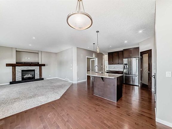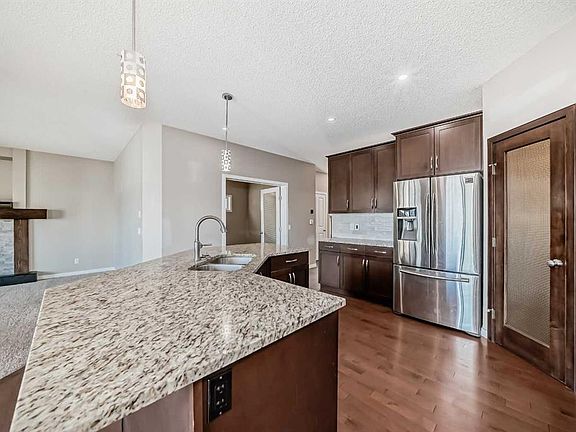 The One You've Been Waiting For in Reunion, Airdrie If you’ve been holding out for that perfect Airdrie home — your patience has finally paid off. Welcome to this beautifully finished walkout home in the sought-after, family-friendly community of Reunion. Nestled on a quiet, low-traffic street, just a short walk to Herons Crossing School, this property is ideal for families looking to settle into a vibrant, welcoming neighborhood filled with parks, playgrounds, and scenic walking paths. Step inside and be greeted by a grand entrance with soaring cathedral ceilings, setting the tone for the spacious, open-concept layout throughout the main floor. The chef’s kitchen features stainless steel appliances, granite countertops, a central island perfect for entertaining, and a convenient walk-through pantry that connects to the mudroom. The adjacent dining area opens to a raised deck with sweeping views — thanks to the home’s elevated position — and stairs that lead to the fully fenced yard below. The cozy living room boasts large windows that flood the space with natural light and a fireplace framed with a rich wood mantle for those cozy evenings at home. A main floor office offers the perfect work-from-home setup, or could easily function as an additional bedroom. Upstairs, the bonus room provides a flexible space — ideal as a playroom, media room, or family lounge. The primary suite is a true retreat, complete with a custom wood feature wall, a walk-in closet, and a luxurious 5-piece ensuite featuring a deep soaker tub, dual vanities, and a stand-up shower. Two more generous bedrooms and a 4-piece bathroom round out the upper level. The fully finished walkout basement is bright and functional, with luxury vinyl plank flooring, a wet bar perfect for game days, and a large rec room with space for a home gym. The 4th bedroom (with rustic barn doors) and a spa-inspired 3-piece bath with heated floors make this the ultimate guest suite. Outside, enjoy the private lower patio, ideal for relaxing while the kids play in the yard. With back lane access, there’s even room to park a trailer. Just minutes to shopping, schools, green spaces, and major routes — this is the one you don’t want to miss.