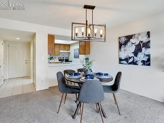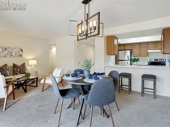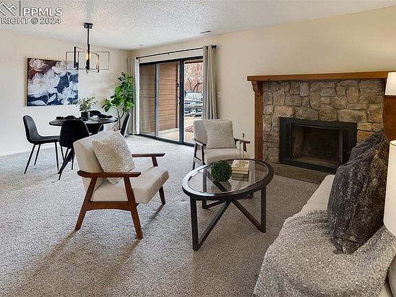 Discover your ideal starter home, investment opportunity, or retirement retreat nestled in the sought-after Rockrimmon area of beautiful Colorado Springs. This cozy, well-lit condo is located on the ground floor making it easy to carry in groceries and let pets in and out. The condo has a large living room with newer carpet and a captivating stone fireplace. The kitchen features stainless steel appliances, a new refrigerator, new sink with a single-hand pull down faucet, an eat-in countertop bar and a dining nook. Enjoy decorator touches with framed mirrors, newer lighting, and a neutral color palette. The master bedroom suite has an attached bathroom. A hall bathroom is also conveniently located close to the second bedroom and living room. Step outside onto your private patio, where you can unwind and enjoy outdoor dining with friends and family. The condo has a dedicated parking space and plenty of guest parking. The community features a refreshing summer pool, gazebo with picnic tables and inviting hot tub. Situated near parks, esteemed District 20 schools, fantastic shopping centers, UCCS and popular restaurants, this is a prime opportunity not to be missed. With its central location and easy access to I-25 and Downtown Colorado Springs, you’ll have all the conveniences you need at your fingertips. Don’t miss this chance to make it yours!