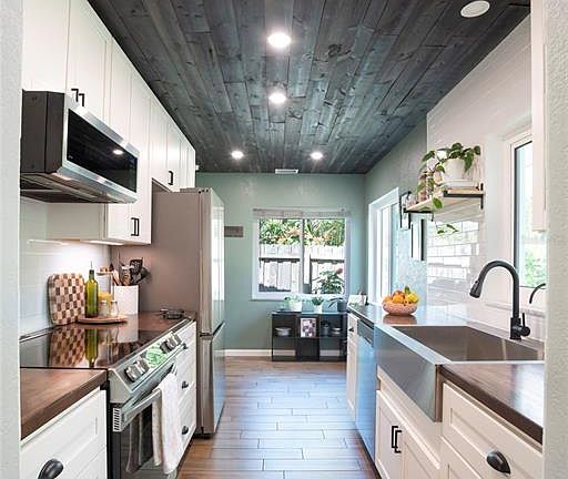 Moen brushed nickel fixturesPorcelain walnut-glaze wood tileStunning kitchenMalibu white shaker cabinetsKohler farmhouse sinkSamsung stainless steel appliancesSoft-close vanities
