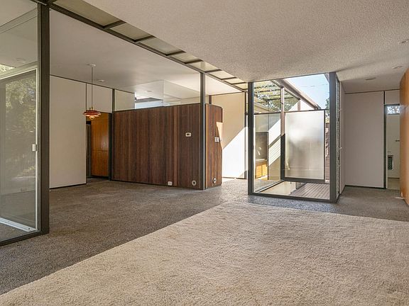 1961-built, mid-century gem for lease in a private, tranquil setting in the Verdugo Woodlands area of Glendale. Incredible original architectural features in this 3 bedrooms and 2 full bathrooms home including walls of glass, hard wood & stone floors, wood paneling, brick fireplace and tile in bathrooms & kitchen. Open floor plan between living and dining rooms with covered patio off dining and kitchen. Huge master bedroom with en-suite bathroom has high ceiling, wall of closet and balcony. Two additional bedrooms are located on the opposite side of home. Second bedroom has door to rear yard and third bedroom easily used as den or office with numerous built in shelves and sliding doors to yard. Modern conveniences include central air conditioning and stainless steel appliances in kitchen. Carport. Enclosed one car garage houses washer & dryer and used for storage.