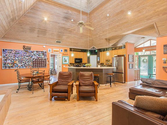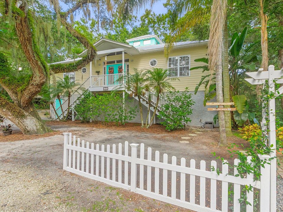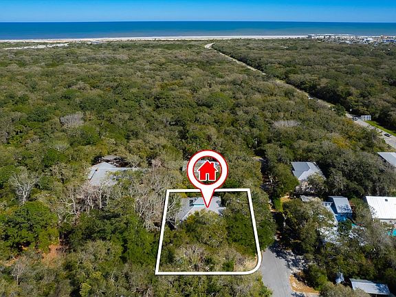Tucked beneath a canopy of majestic oaks on a generous corner lot, this distinctive five-bedroom, three-bath home offers an unbeatable location just one block from Anastasia State Park and a short bike ride to the beach in Menendez Park. Featuring a side-entry two-car garage, this residence effortlessly combines timeless charm, character, and the laid-back coastal lifestyle. Step inside to a breathtaking main living area, where soaring 20-foot wood ceilings create an inviting, airy ambiance bathed in natural light. The heart of the home features a warm and welcoming living room anchored by a fireplace, perfect for cool ocean-breeze evenings. A formal dining room offers the ideal space for hosting lively dinners, while the open-concept design flows effortlessly toward a screened porch that stretches across the entire back of the home—your own private oasis for morning coffee, sunset cocktails, or unwinding to the soothing sounds of nature. The upper level also boasts a serene master suite, a restful retreat designed for relaxation, along with a charming guest bedroom and a full bathroom. Down a spiral staircase, the lower level offers a flexible and private living space with a cozy sitting room, three non-conforming rooms, and another full bath—perfect for guests, a home office, or a creative studio. The garage offers an oversized area perfect for a 3rd car, gym or craft area and a place to house all the bikes and beach toys. This home also features two 30 amp RV hookups and black water drains for any extra guests that want to stay in their RV, or short term rent an on-site RV for extra income. Surrounded by the salty breeze and just minutes from the shore, this home has never flooded and is an open invitation to embrace a laid-back coastal lifestyle. Whether you're spending the day at the beach, biking through Anastasia State Park, or entertaining under the stars, this property is the perfect place to call home. Not only are you near the beach and Anastasia Park, but you also have The Village Garden Food Truck Park nearby. Anastasia Island offers dining, entertainment, coffee and shopping nearby. Whether you are looking for an investment property (short term rental permissible), a second home or a primary home, this home is ideal. Also enjoy instant savings on carrying costs of this home as it's located on Anastasia Island but is not considered City of St. Augustine or St Augustine Beach so, owner only pays county taxes!