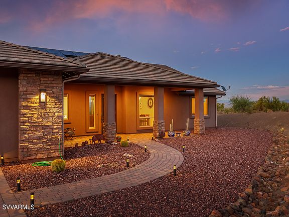 Discover this custom Hamman home, NO HOA built in 2020, on 1.61 acres in Cottonwood's coveted Quail Springs area. Offering 3 bedrooms, 3 baths, and breathtaking views of Sedona's red rocks and Mingus Mountain, this property is a rare find. Inside, enjoy locally sourced alder wood doors and cabinetry. The kitchen showcases an artisanal copper sink and vent hood crafted by a local coppersmith, blending beauty and function. The living room stuns with floor-to-ceiling stonework, a steel I-beam mantle, and 16x10 sliding glass doors that frame panoramic views. An entertainer's dream, this home includes an indoor/outdoor bar with pocket windows, a custom stone fire table, and an extended paver patio for seamless outdoor living. The split floor plan ensures privacy, featuring a primary suite with a rainfall shower, stargazing windows, and a large walk-in closet. Two spacious bedrooms share a Jack-and-Jill bath. Amenities include a private 650-foot well, 9kW solar system, 60-amp RV hookups, and a 1,300 sq. ft. garage with three bays. Additional space below the home is ready for a casita or in-law quarters. Surrounded by a landscaped mini orchard of peach, plum, and apple trees, this property has no HOA or rental restrictions. Schedule your private tour todaythis home must be seen to be believed!