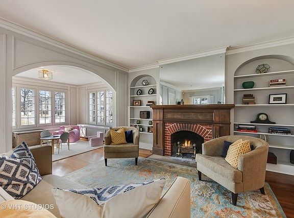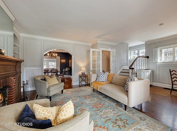 Exceptional classic home with inviting front porch, updated large kitchen, fresh new decor and all the right spaces in all the right places! Graceful, expansive Living Room features handsome fireplace, custom built-in book cases, arched large doorways, crown moldings, lovely hardwood floors plus opens to the bright Sunroom. Lovely Dining Room ready for entertaining. All together creating beautiful, spacious first floor with rooms flowing openly to each other. Sharply updated cook's Kitchen has maple cabinets, granite counters, SubZero refrigerator, Bosch dishwasher and h-u-g-e breakfast area leading to superb Family Room + deck and big backyard. Ideal layout for all age groups! Deluxe Master suite with additional ensuite bath and sitting room (perfect for a study or nursery.) Renovated 3rd floor:new windows, new insulation, new carpet, fresh paint ... ideal retreat for guests, teen, office, nanny. Basement playroom, storage. Near train, parks, village & McKenzie too!
