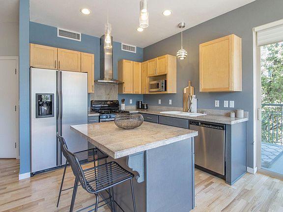 Come see the hidden gem downtown that is Creekside at this unfurnished 2 bed, 2 bath condo with 2 garage parking spaces included with rent. Very quiet private drive leads to this light-filled corner residence with large windows in both bedrooms and the main living area. The extra large balcony is covered. Kitchen has plenty of counter space with an island and gas range. The master bath has separate shower and tub. In-unit Washer & Dryer included. Pets welcome. 12, or 16 month lease available.