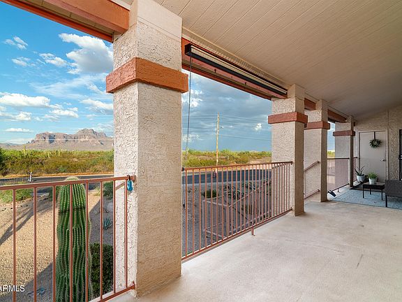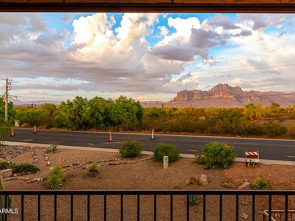 Enjoy fantastic views of Superstition Mountain from all windows in your upstairs condo and your upper deck! This 2 story condo has 2 bedrooms and 1 bath on lower floor and upper loft which can be your office, hobby room or additional bedroom. Bathroom is fully remodeled with new comfort height toilet, raised cabinet with granite counter, and newer shower. AC approx 8 years old. Each unit has 1 assigned covered parking spot. Community is close to Multi-gen Center, Library, restaurants, in Apache Junction. This building boasts the best views in the entire community with State owned land located across the road. Carpet is 1 year old with water proof laminate floor in kitchen. Cook top stove 1 year old. RO in kitchen with bathroom water filtered through RO. Big storage closet in great room. Additional storage located outside on your front deck. Sit outside and enjoy spectacular views, sunsets, sun rises and nature from your front deck. New glass in all windows except the bedroom with one window.
