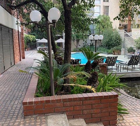 Freshly painted, laminate floors, 1 bedroom, 1 bath condo near UCLA, stove, new refrigerator, dishwasher, microwave, laundry on site, balcony, a/c, tandem parking (space for 2 cars) building amenities include beautiful lobby, doorman, swimming pool, jacuzzi, exercise room, sauna, koi pond HOA pays utilities