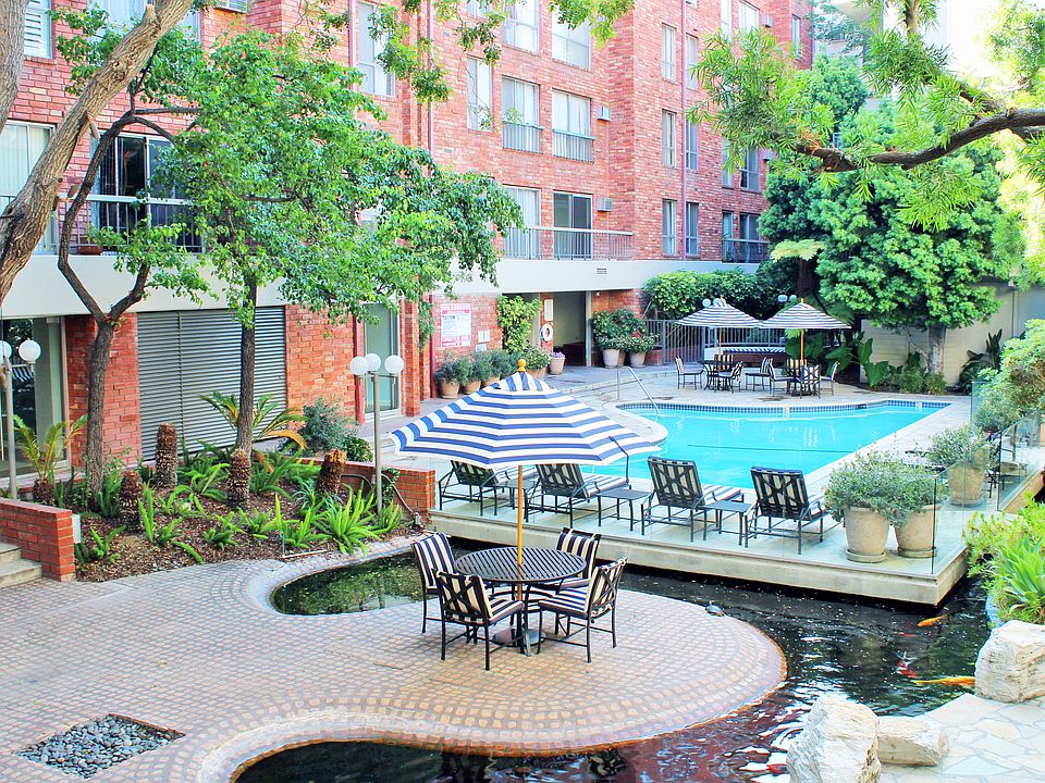 Sun-filled and quiet exterior unit in the 24/7 full-service Building The Colony in Westwood. The unit has been partially remodeled with brand new bathroom and newer laminate floors. Kitchen with stainless appliances opens up to the dining area and living room which creates a very social space. Spacious bedroom with carpet and plenty of storage. The building recently underwent a major renovation and has amenities including a huge pool area with Koi and Turtle ponds, multiple sun decks and hang out spots, fitness center with steam room & sauna, conference room, party room w/ kitchen & more. Approximately 1/2 mile to UCLA and right across from Westwood Park