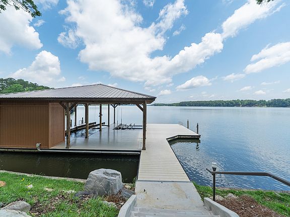 A RARE FIND ON LAKE OCONEE - A HOME WITH A BOATHOUSE, DEEP WATER, AND BIG WATER VIEWS. This lovely home sits on an acre of property on a point and has one of the less than 15 boathouse permits granted on Lake Oconee. Enjoy fishing off the 180 feet of shoreline with its concrete sea wall or anywhere from the Max dock. The dock has hollow core vinyl decking to keep your feet cool in the summer, and both a boat and wave-runner slips with heavy duty I-beam electric boat lifts, and a 4 x 8 storage shed. Plenty of room to put your patio furniture under roof and enjoy the shade or swim in the 11-12 feet of water off the dock. The home sits 40 feet from the shoreline and has a full walk out basement that leads straight to the dock. A solar powered gated entrance welcomes you down a paved drive to a home filled with natural light and thoughtful details. Vaulted tongue and groove ceilings, expansive windows, custom cabinetry, and bamboo flooring create an elegant, airy ambiance. The tiled sunroom opens to a large concrete patio and a scenic walkway to the lake. The gourmet kitchen includes stainless steel appliances, honed marble countertops and a 9-foot center island with a cooktop which is perfect for hosting. The cabinetry has large storage built in hutch and all custom pull-out shelves. The dining area flows into the family room with a floor to ceiling 14-foot natural stone, masonry fireplace equipped with gas logs and a remote start. The main-level owner's suite features a huge 18 x 24 primary bedroom with cathedral tongue and groove ceilings. The suite includes a large walk-in closet with custom organization, a bath with dual vanities and cherry cabinetry and an adjoining laundry room. Two additional over-sized bedrooms, a full bath, and large linen closet are in a separate wing of the main level perfect for privacy. A separate HVAC system for this area. The finished basement includes a spacious family room with a 9-foot natural stone, masonry fireplace equipped with gas hook up. A bonus room currently used as a 4th bedroom, a full bath, and a kitchen with full size refrigerator, and oven. This full walkout has large windows to enjoy spectacular views of the lake. In the rear of the basement is a large storage area that houses the furnace, water heater and well pressure tank, and sump pump. The basement had the Aqua-Guard system installed in 2014 on the full perimeter of the foundation. 1440 Wood Cove Rd is correct address, use for GPS.