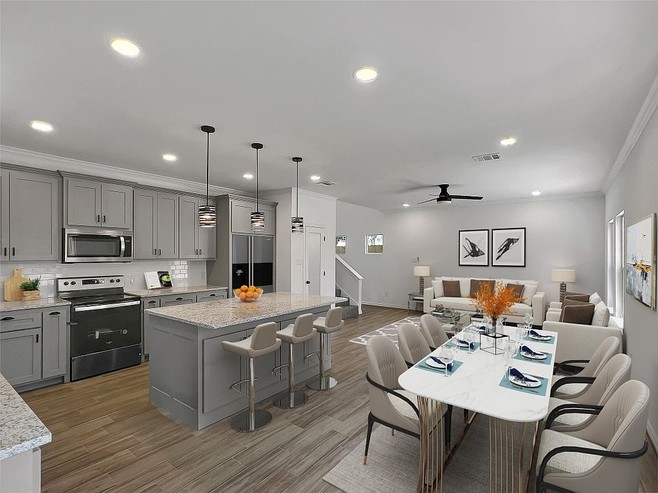 - Decorative/Designer Lighting Fixtures, Double Vanity, Granite Counters, Kitchen Island, Open Floorplan, Pantry, Walk-In Closet(s)