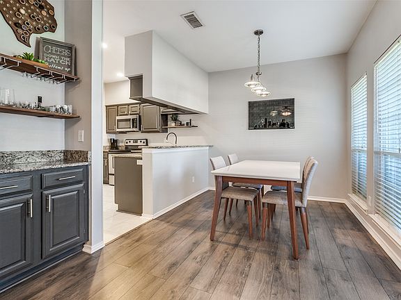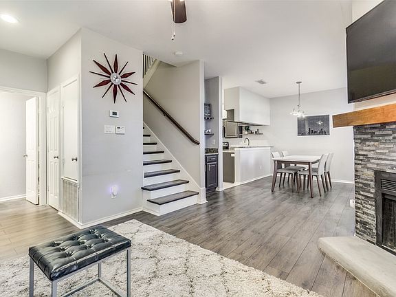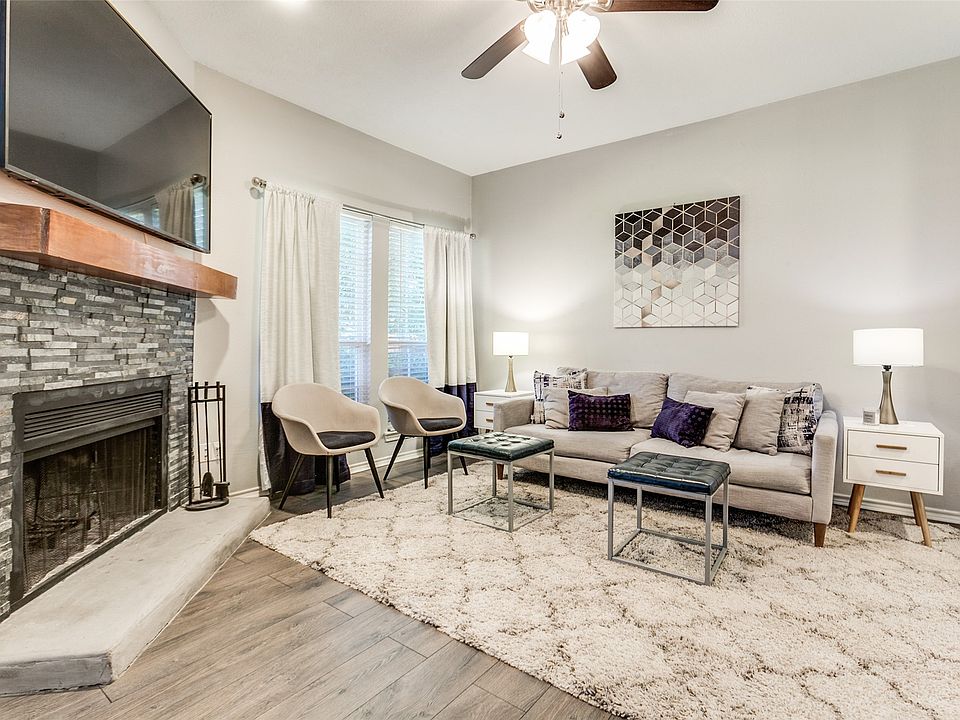 Discover this stunning, low-maintenance end-unit condo nestled in a gated community in the heart of Addison. Step inside to find gorgeous wood-look luxury vinyl plank flooring and an open-concept layout that seamlessly connects the living, dining, and kitchen areas—perfect for entertaining. The light-filled living room features a cozy wood-burning fireplace with a beautiful tile surround. Utilize your culinary skills in the fully equipped kitchen with granite counter-tops, sleek stainless steel appliances, and modern cabinet hardware. The dining area offers access to your own covered patio that backs to a peaceful community greenbelt and is perfect for relaxing with your morning cup of coffee or grilling. Upstairs, you'll find two spacious bedrooms, each with its own beautifully updated ensuite bath for ultimate comfort and privacy. Enjoy community amenities including a sparkling pool and hot tub, and take advantage of the unbeatable location with quick access to major highways, top dining, entertainment, and shopping at The Galleria.