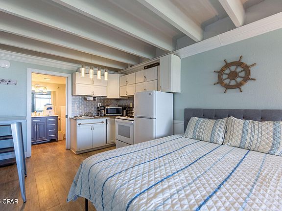 Inside, you'll find a thoughtfully designed space with an open layout, coastal décor, and a kitchenette, making it perfect for a weekend getaway or vacation rental. Large windows fill the condo with natural light and frame the sugar-white sands and emerald waters just steps away.