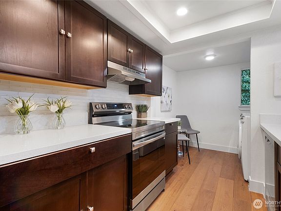 Sophisticated contemporary updates on top floor. Vaulted ceilings, light colors & smart floorplan. Chef’s kitchen features new custom cabinets & quartz counters, brand new appliances & new wa/dryer off kitchen. Great site lines to spacious family rm w/new fireplace. Dining area w/access to private deck w/nature views. Generous primary suite w/updated bath: tile accented shower room & double-size closet. Guest room w/adjacent full bath & new tile surround. Desirable spot w/Grassy area in front & privacy in back. Covered parking w/storage & ample guest parking for extra cars. Cmu pool, clubhouse & sports court. Nearby shopping, dining & trails. Kent Schools. No rental cap. No special assessments. Close to Airport, D/T Renton, Bellevue & more!