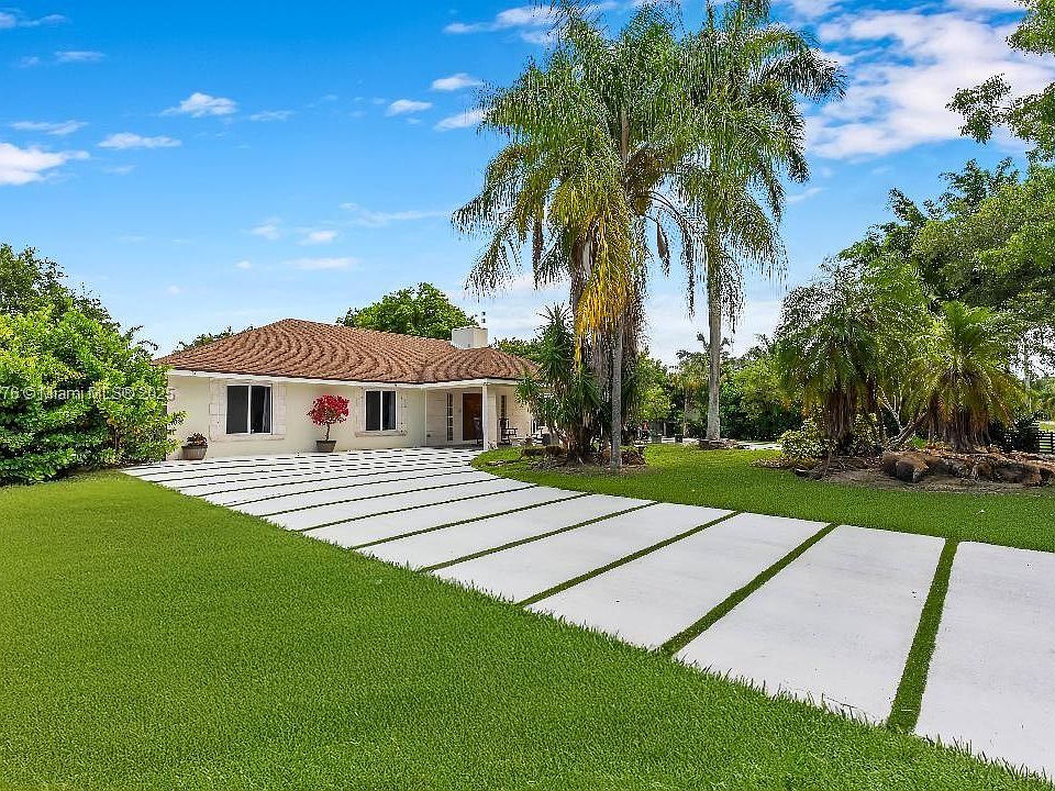 5467 SQ FT HOME. Main house is 3923 SQ FT Guest house is 1544 SQ FT Welcome to your luxurious oasis! Stunning property on a private road, offers you the epitome of luxury, exclusivity, and privacy on a builder’s acre. Fully remodeled in 2024/2025. 6 bedrooms, 3.5 baths and new addition. Open kitchen design with island & quartz counters, SS appliances, impact windows, vaulted ceilings, fireplace, security cameras, putting green/playground, Heated Endless Pool with slide, 2 gazebos, electric aluminum fence, gym, home theater, commercial water purification, lush landscaping featuring 175-ft Royal Palms, 33,500 ft concrete driveway, carport, basketball court, double roof design with skylights 2016/2024. Huge luxurious 700sf master suite with 2025 master bath and family room. Original owner