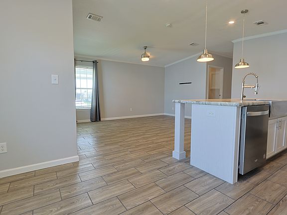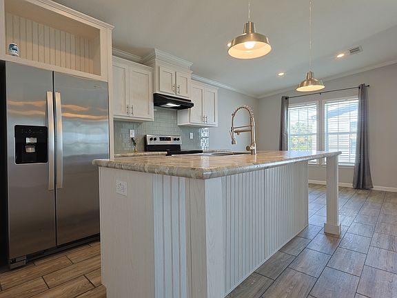 This updated home features an open layout with a spacious kitchen, large island/bar, and included appliances. The living and dining areas flow together seamlessly, while the primary suite offers a double-sink vanity, upgraded cabinetry, and linen closet. Upgraded laminate flooring runs through the main living areas, with cozy carpet in the bedrooms. Enjoy peaceful views with a private backdrop of the creek. (Interior photos are Stock Photos Only)