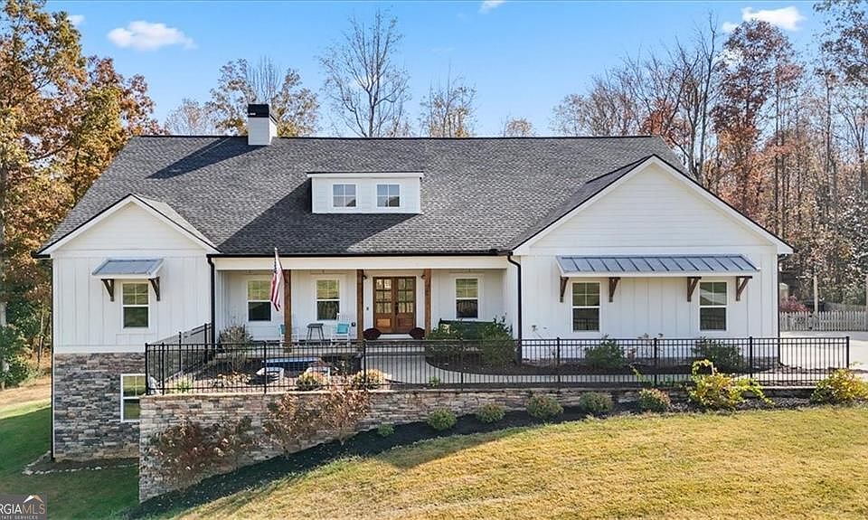Charming Modern Farmhouse on 4.82 Private Acres - A Lifestyle of Space, Serenity & Comfort Welcome to your own private retreat, where modern farmhouse charm meets the freedom of nearly five acres of peaceful countryside. Perfectly set on a partially wooded 4.82-acre lot, this exceptional home offers the space to breathe, room to roam, and a setting designed for both everyday living and memorable moments. Begin your mornings on the welcoming front porch and end your evenings watching sunsets from the back deck, surrounded by nature. The gently cleared front yard provides ideal space for play, gatherings, or simply enjoying the open air, while the wooded backyard creates a serene backdrop and added privacy. A fenced garden area with raised beds and a charming picket fence invites you to grow flowers, herbs, or vegetables and embrace a slower, more intentional lifestyle. Inside, the home is light-filled and thoughtfully designed for connection and comfort. Cathedral ceilings crown the spacious great room, flowing seamlessly into the dining area and stunning chef's kitchen - truly the heart of the home. Custom white cabinetry, granite countertops, and high-end GE Cafe appliances create a space equally suited for entertaining guests or enjoying quiet family meals. A dedicated office or optional formal dining room offers flexibility for work-from-home needs or hosting special occasions. The luxurious owner's suite is a private retreat, featuring a spa-inspired bath with dual vanities, soaking tub, oversized tiled shower, and abundant natural light, along with a huge walk-in closet. A split bedroom plan provides three generous secondary bedrooms and a beautifully appointed hall bath, offering comfort and privacy for family or guests alike. Designed for real life, the oversized laundry and mudroom includes custom cabinetry, ample storage, and a sink - perfect for busy households. Additional features include a kitchen-level two-car garage, extra-wide stairs leading to an unfinished basement stubbed for a bath and ready for future expansion, and a walk-up attic with permanent stairs, ideal for storage or finishing into additional living space. Blending timeless farmhouse character with modern amenities and endless possibilities, this home offers a rare opportunity to enjoy privacy, flexibility, and a true sense of home - all while creating the lifestyle you've been dreaming of.