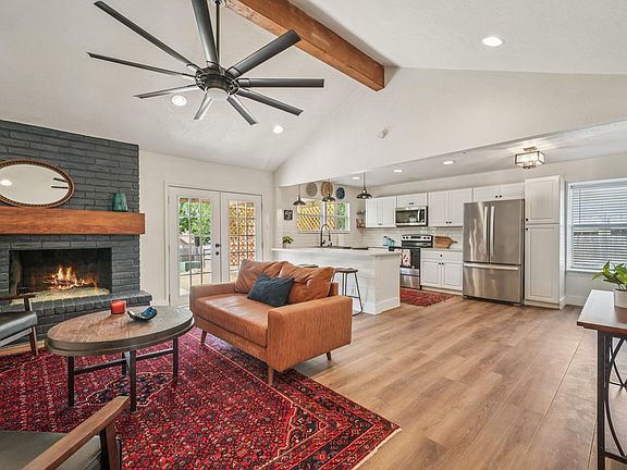 Welcome to this beautifully updated 3-bedroom, 2-bath home—a perfect blend of comfort and style! Inside, you’ll find luxury vinyl plank flooring, sleek white cabinets with black hardware, stainless steel appliances, and elegant white marble countertops. The kitchen opens seamlessly to the living room, where a striking rock gas fireplace creates a warm focal point. A fresh, neutral color palette ties it all together. Step outside to enjoy the covered patio crafted with treated lumber, a spacious yard with raised garden beds, and a privacy cedar fence—ideal for relaxing or entertaining. Additional updates include modern exterior lighting, a thoughtfully designed laundry room with cabinetry and shelving, a roof replaced in 2020, and an EcoBee smart thermostat installed in 2021. This home has the upgrades you want with the charm you’ll love!