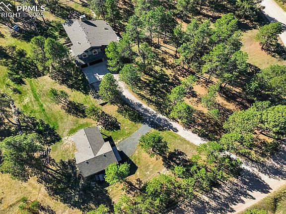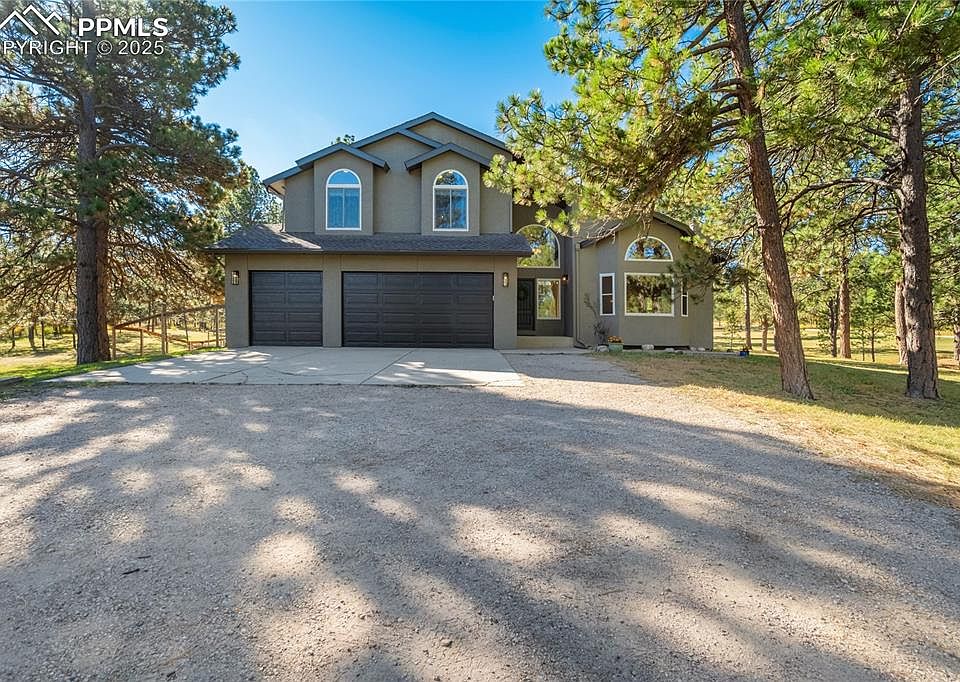 Elevated Living | Serenity Among the Pines—Where timeless design, natural beauty, and peaceful living converge. Nestled on a private, 5-acre treed corner lot zoned for horses, this beautifully crafted home offers the perfect blend of elegance, warmth + functionality. Thoughtfully updated, it balances classic architecture with modern comforts + an effortless connection to its serene natural setting. The main lvl welcomes you w/hardwood floors, soaring vaulted ceilings + abundant light that enhances the open flow. The formal living room features a bay-window seat overlooking the wooded landscape + a cozy gas fireplace, while the adjacent dining room is ideal for festive gatherings. The great room impresses w/a dramatic floor-to-ceiling stone wood-burning fireplace + opens to the gourmet kitchen—showcasing white cabinetry, Silestone countertops, a large island w/seating, walk-in pantry + stainless-steel appliances including double ovens, a 5-burner gas cooktop + exterior-vented hood. The expansive main-level owner’s suite is a peaceful retreat offering 2 walk-in closets w/custom built-ins + a luxurious 5-piece ensuite complete w/heated tile floors, dual granite vanities, soaking tub + walk-in shower—plus private walk-out access to the patio + hot tub. Upstairs, a Jr Suite w/a private composite deck & ensuite bath provides flexibility, along with 3 additional bedrooms + an updated full bath. The finished walk-out basement offers ample storage + is pre-plumbed for a future pellet/wood stove + wet bar. Add Highlights: New Class IV roof (2023), Boiler (2025), Carpet + Interior Paint (2025) + updated lighting. Outdoor living shines w/greenhouse, loafing shed, chicken coops + 6 car garage. With no HOA + minimal covenants, enjoy the freedom of country living just minutes from the Pineries Open Space—where trails for hiking, biking, and horseback riding await. Award-winning D20 schools and an easy commute to both Colorado Springs + Denver complete this one-of-a-kind retreat.