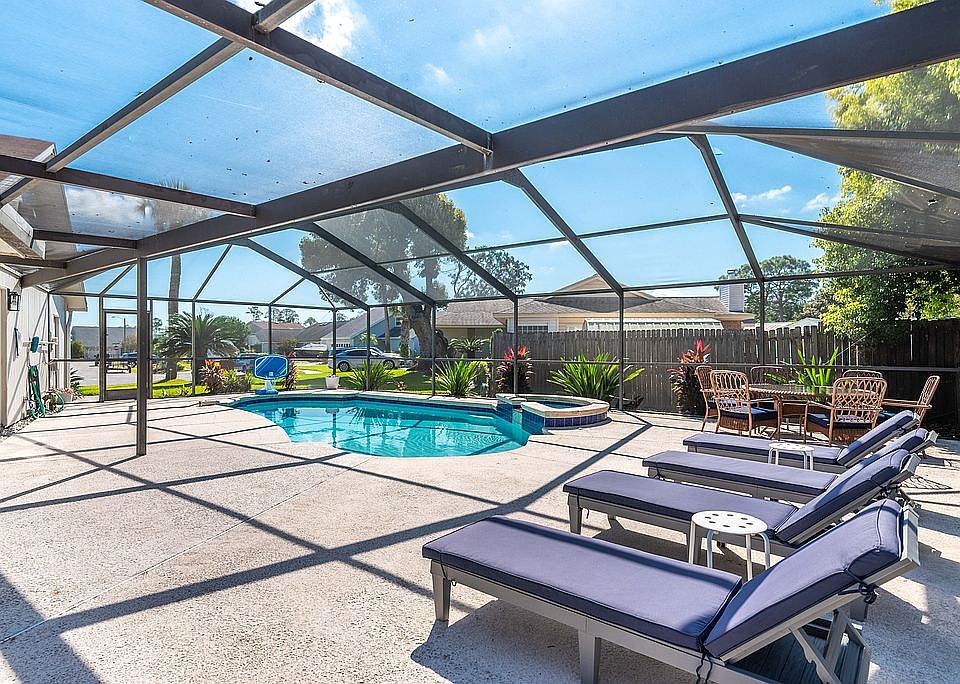 The screened-in pool boasts a recently installed $7,000 heater for year-round swimming. The kitchen patio has a tongue-and-groove ceiling and leads to the large, totally fenced-in backyard. Major systems are solid ages: roof (9 yrs), AC (8 yrs), and water heater (2 yrs). The plumbing was changed to PVC before current owner purchased home in 2017.