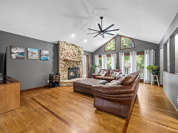 Enjoy resort-style living in your own backyard with this in-town acreage retreat! Entertain with ease on the oversized deck or relax by the sparkling in-ground saltwater pool and patio, new in 2023. Inside, the remodeled kitchen with double ovens flows into spacious gathering areas, including a living room with dramatic floor-to-ceiling stone fireplace and a sunroom filled with natural light from skylights and walls of windows. Hardwood floors and a split-bedroom floor plan add comfort and style, while the finished walkout lower level offers a family room, second fireplace, and direct access to the outdoors. A 3-car garage and county taxes make this property as practical as it is inviting.